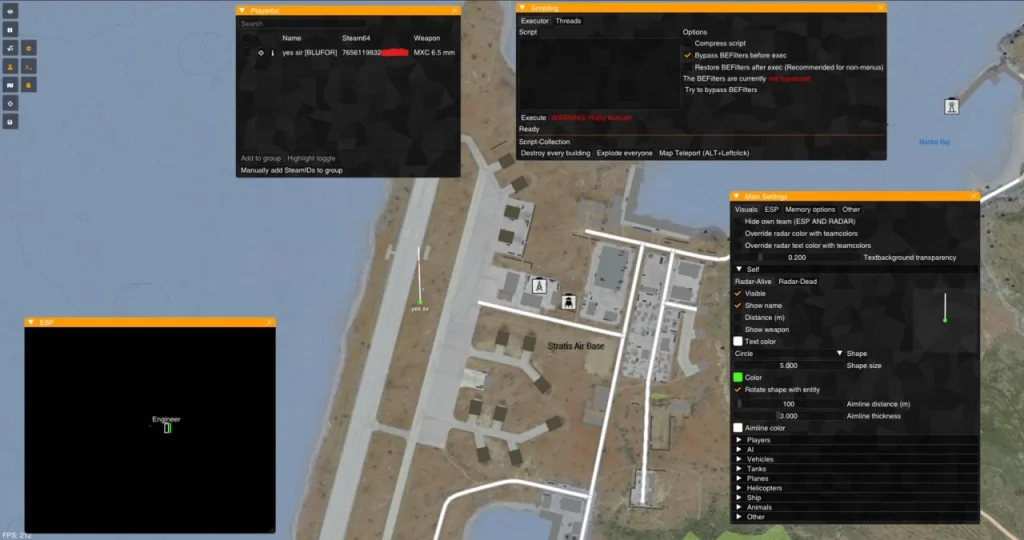 - Настройка ESP для: себя, игроков, ИИ, транспорта, танков, самолетов, вертолетов, кораблей и животных