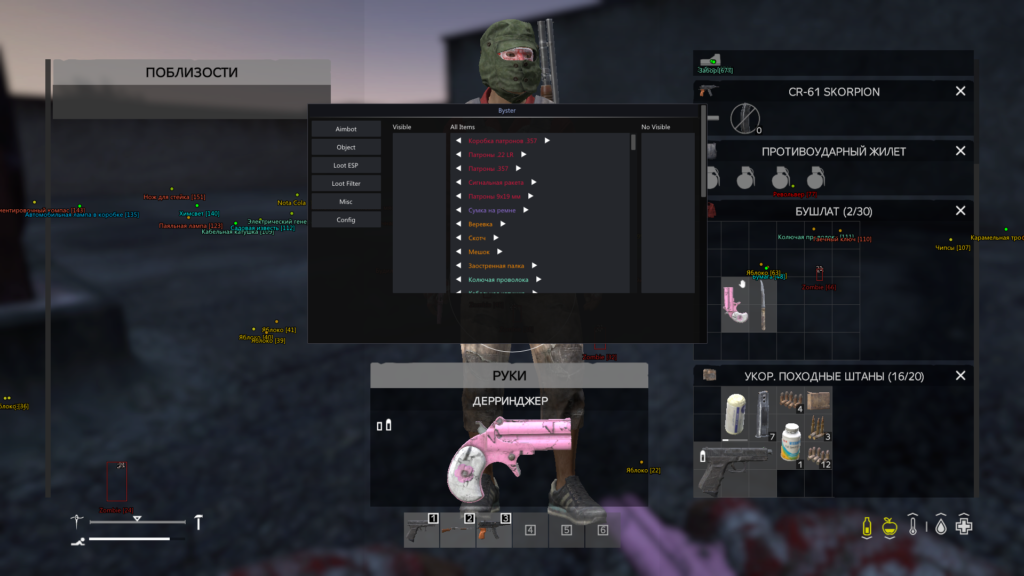 BYSTER - Данный софт для Dayz имеет уникальный функционал, которого вы не найдете ни в одном другом чите. Ключевые нововведения: онлайн-карта для серверов с картой Чернорусь и фильтр лута, который поможет вам видеть в ESP те предметы, которые вам необходимы. Также софт имеет встроенный спуфер для обхода бана по железу. Удобен в использовании, комфортен в игре, постоянные обновления и качество - это главные правила, которыми руководствуется данный провайдер читов.