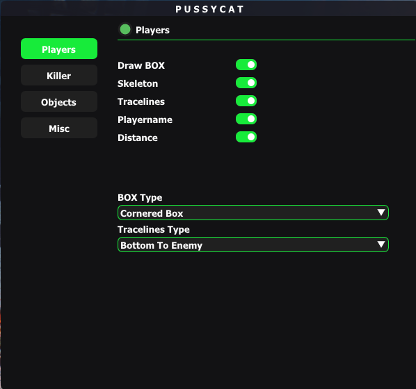 PUSSYCAT - один из топовых провайдеров приватных читов для различных игр. Данный чит на DBD, зарекомендовал себя с лучшей стороны, регулярные обновления, хороший функционал, много положительных отзывов и все это по доступной цене!