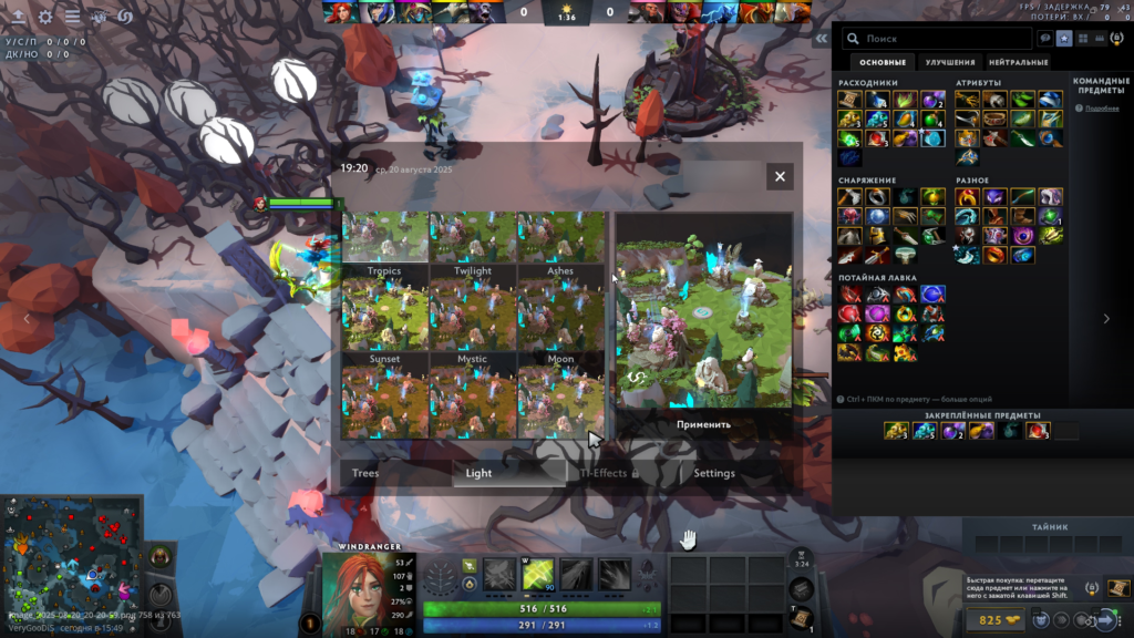 - Билдер показывает лучшие сборки на вашего героя, согласно текущей мете