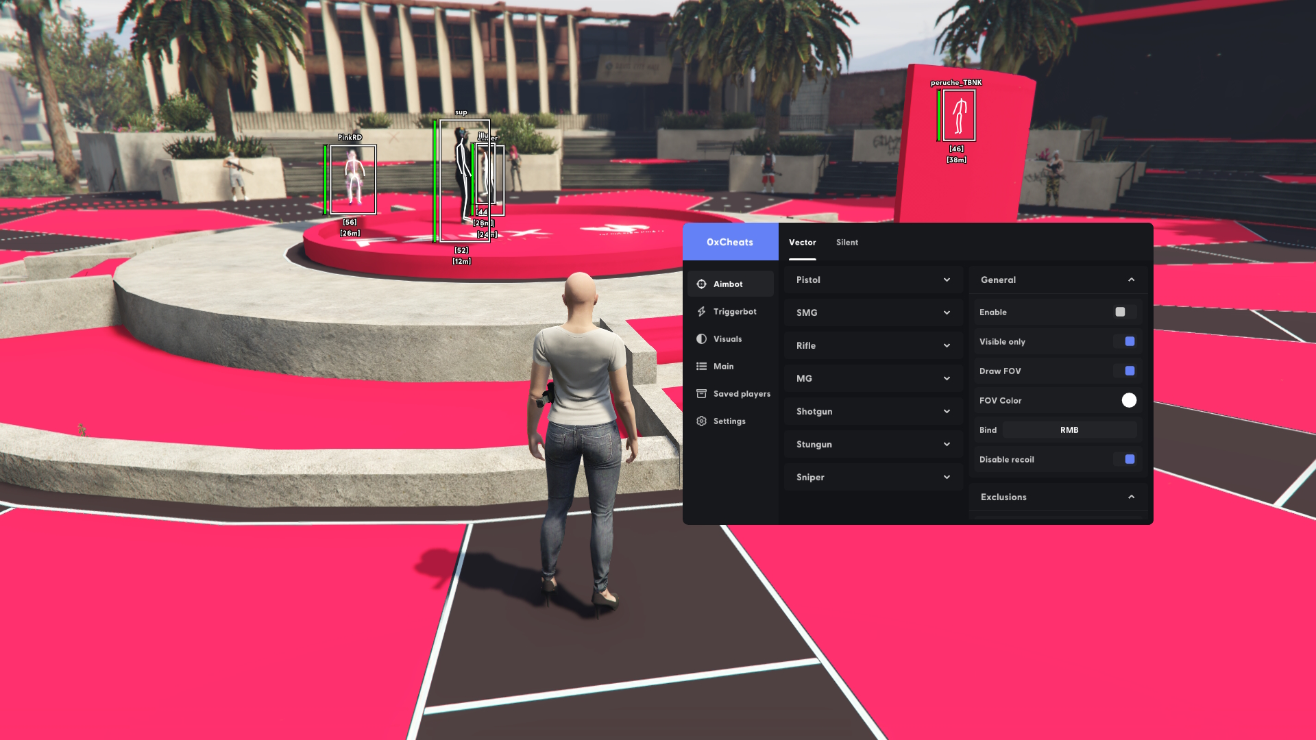 - • Settings (Visible check / Draw FOV / FOV Color / Bind / Disable recoil)