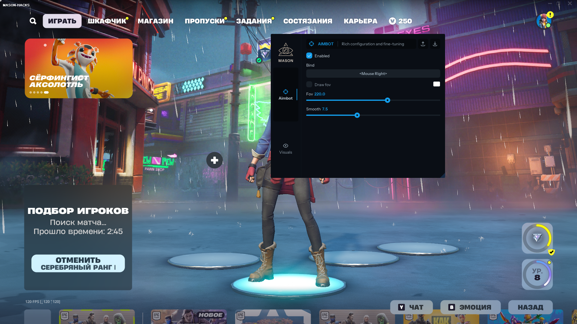 Mason Axe - один из топовых провайдеров приватных читов для различных игр. Данный чит на Fortnite, зарекомендовал себя с лучшей стороны, регулярные обновления, хороший функционал, много положительных отзывов и все это по доступной цене!