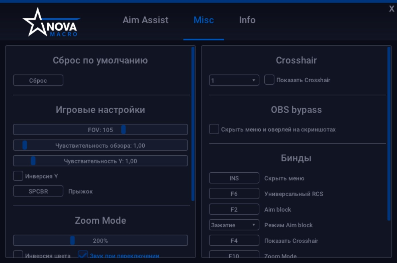 - Множество дополнительных функций, таких как Fast rotate, Crosshair, Anti-AFK и др.