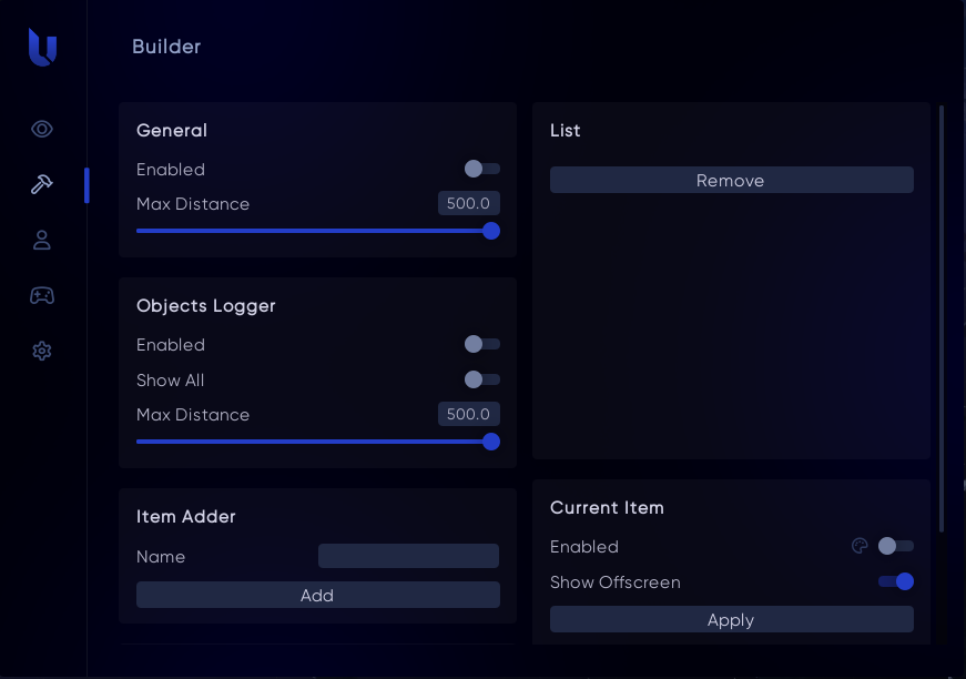- Fully featured objects builder. You can make your own esp based on item names hashes.