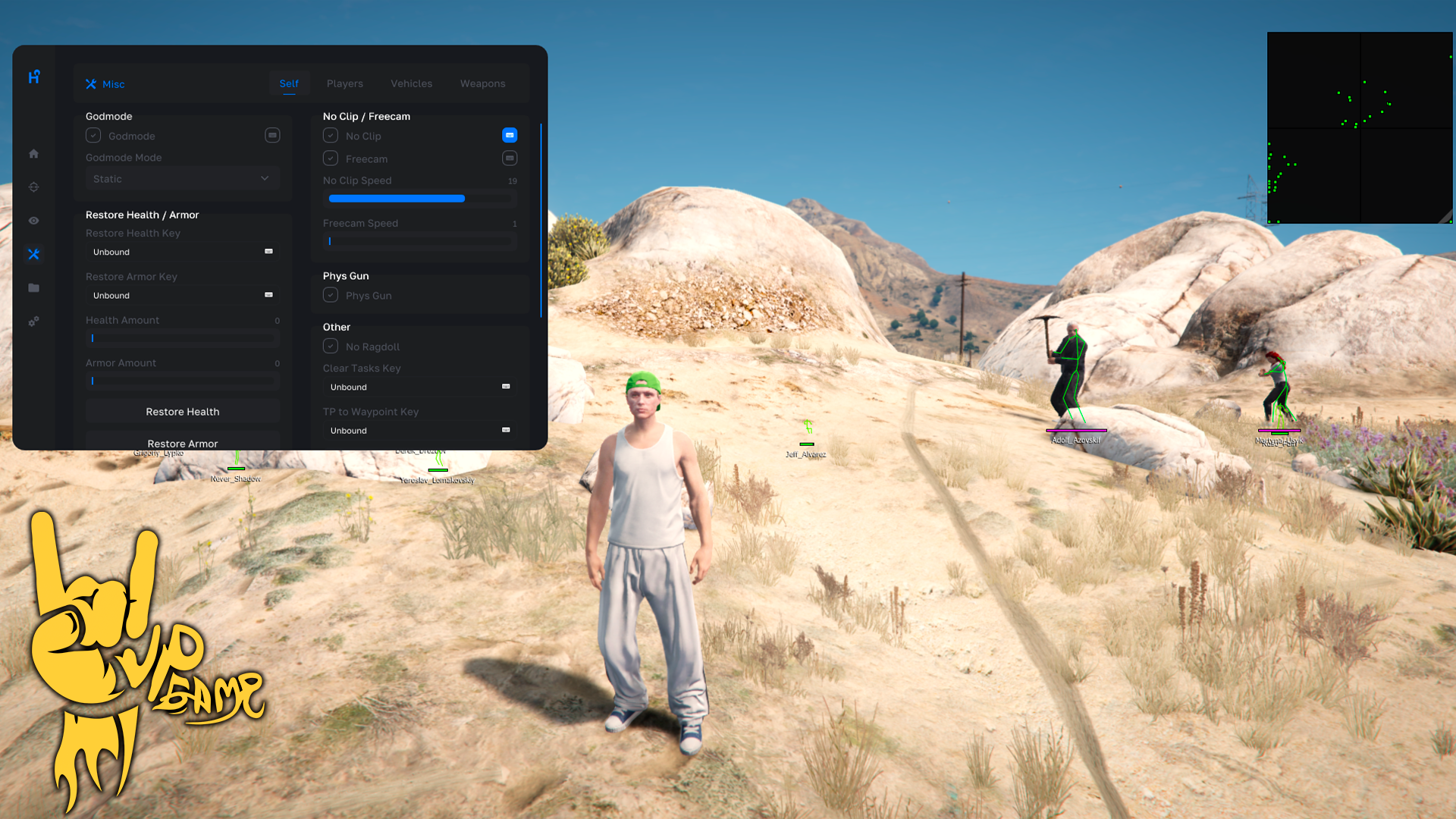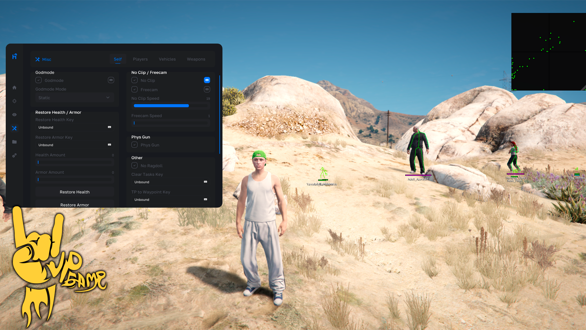 - Misc: Player: NoClip, Godmode, Semi Godmode, Clear Tasks, No Ragdoll, Suicide, Runspeed and Swimspeed modification, TP to Waypoint, Restore Health /