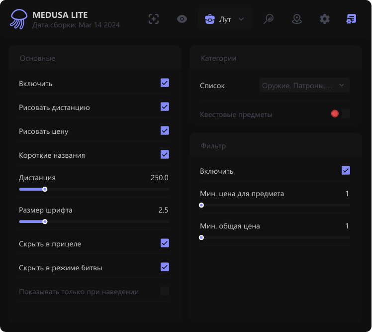 MEDUSA - один из топовых провайдеров приватных читов для различных игр. Данный чит на EFT, зарекомендовал себя с лучшей стороны, регулярные обновления, хороший функционал, много положительных отзывов и все это по доступной цене!