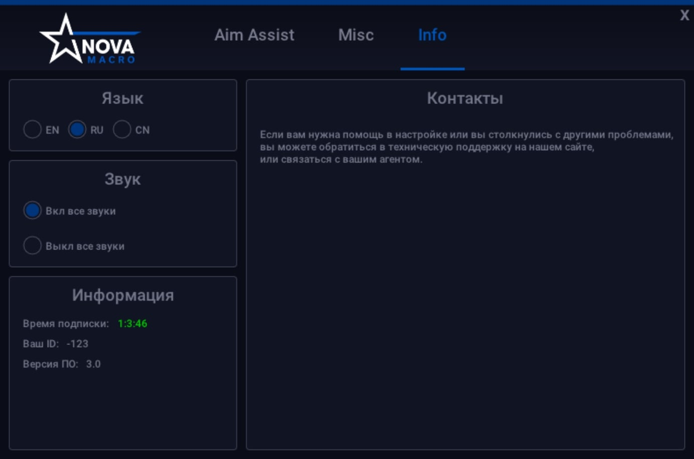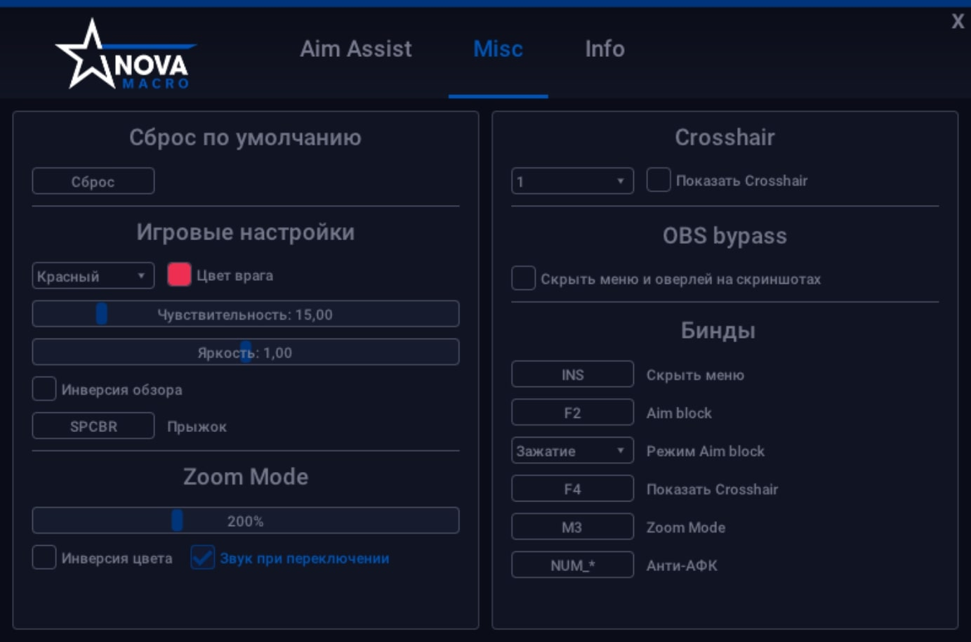 - Скрытие меню — полное скрытие меню по одной кнопке, без выключения работы аим-ассиста,