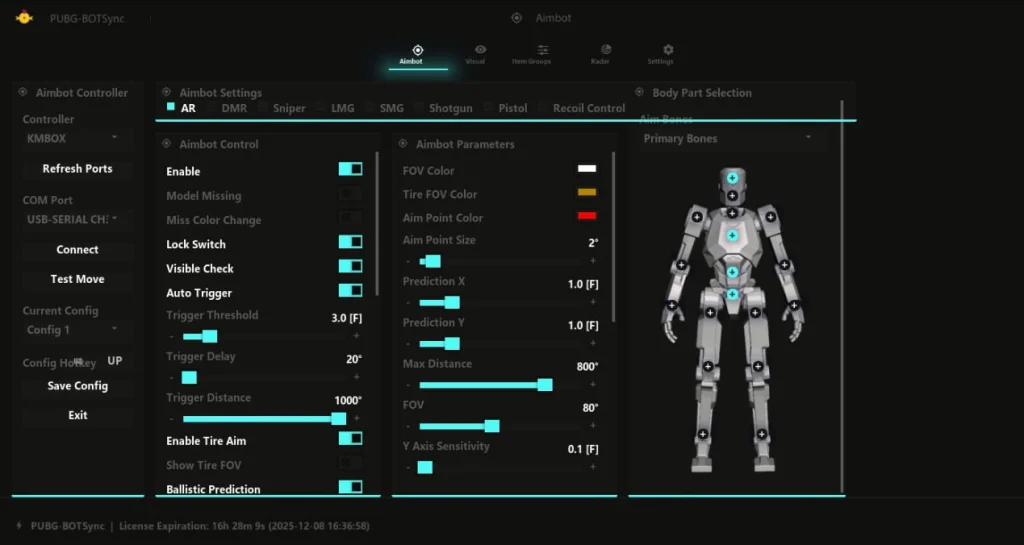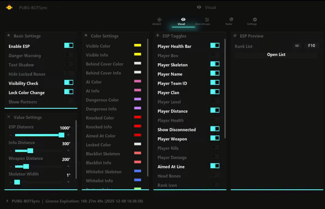 - Настройка ESP и Aimbot для каждого оружия — настраиваемые параметры для AR, DMR, SMG, дробовиков, пистолетов, оружия ближнего боя и метательного оружия.