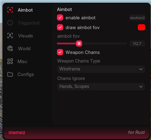 Memez External - один из топовых провайдеров приватных читов для различных игр. Данный чит на Rust, зарекомендовал себя с лучшей стороны, регулярные обновления, хороший функционал, много положительных отзывов и все это по доступной цене!