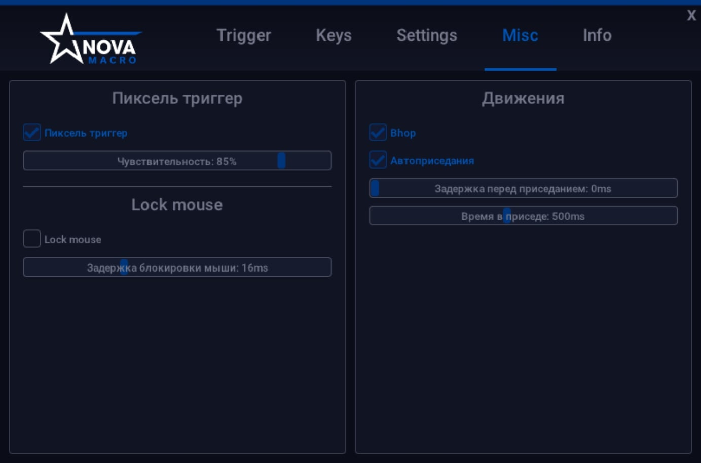 - Множество дополнительных функций и настроек, таких как Auto Crouch, Anti-AFK, Bhop,